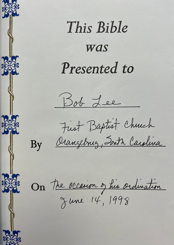 FBC presented me a special ordination Bible from which I preach on special occasions. Inscribed inside the front pages are the following words from Dr. Bill Coates: